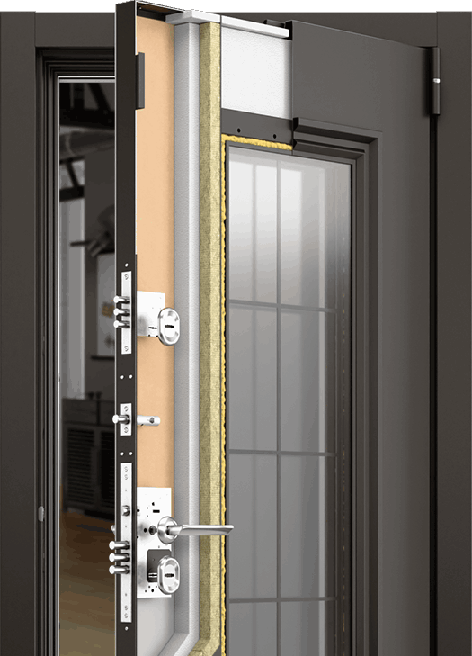 В основе двери — запатентованная конструкция короба ТЕРМОКОМПОЗИТ. Это комбинированное решение из металла и ПВХ-профиля, где сталь отвечает за жесткость и прочность, а пластик работает как терморазрыв, сохраняя тепло зимой и прохладу летом.